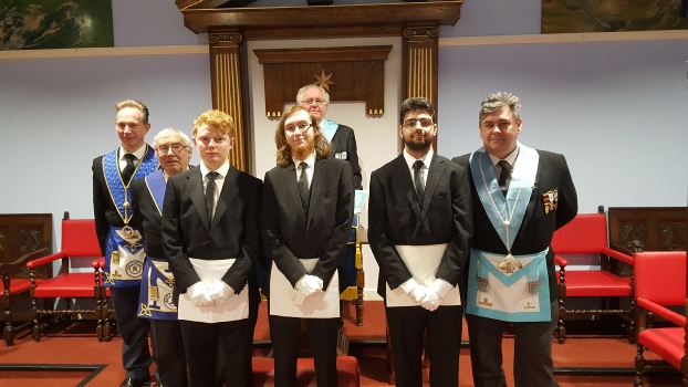 Photo shows the first three University initiates to St Davids Lodge. Front Row in White Regalia left to right; Luke Bidder (Wales), Tyler Marin (Texas), Nedeslav Petronov (Bulgaria). Back Rows in Blue Regalia left to right; Peter Williams (former Lecturer), David John Siviter (Former Lecturer) Alun Jones (Chair), Martin Wyn Jones (Former Research / Lecturer and Bangor Alumni)